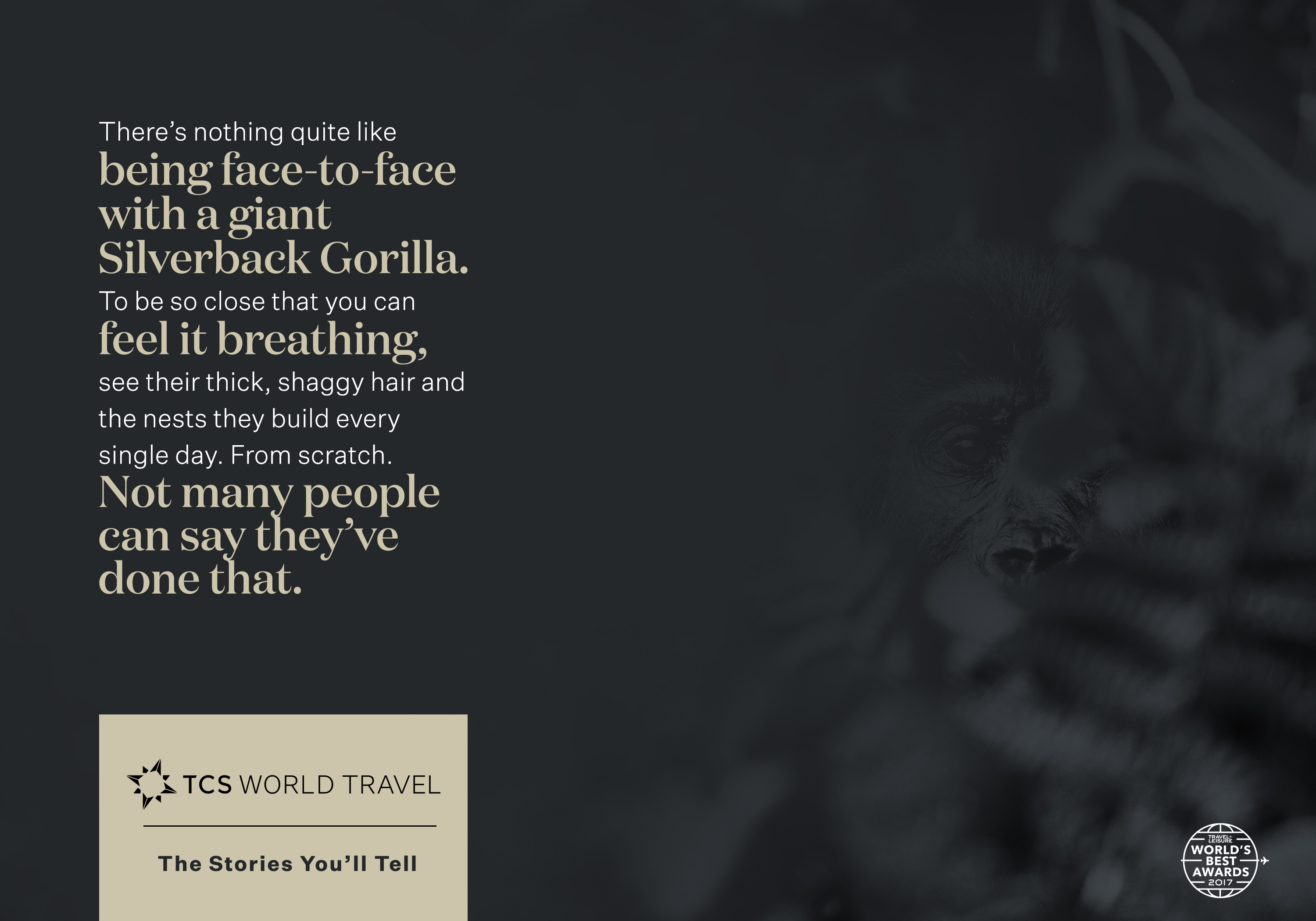 TCS World Travel is an elite travel service that provides one-of-a-kind trips to parts of the world that are uncharted by the average person. They tasked us with creating a brand awareness campaign that shows off their ability to deliver trips – and experiences – you’ll remember for a lifetime. I came up with the conceptual directions and wrote all the words for both.