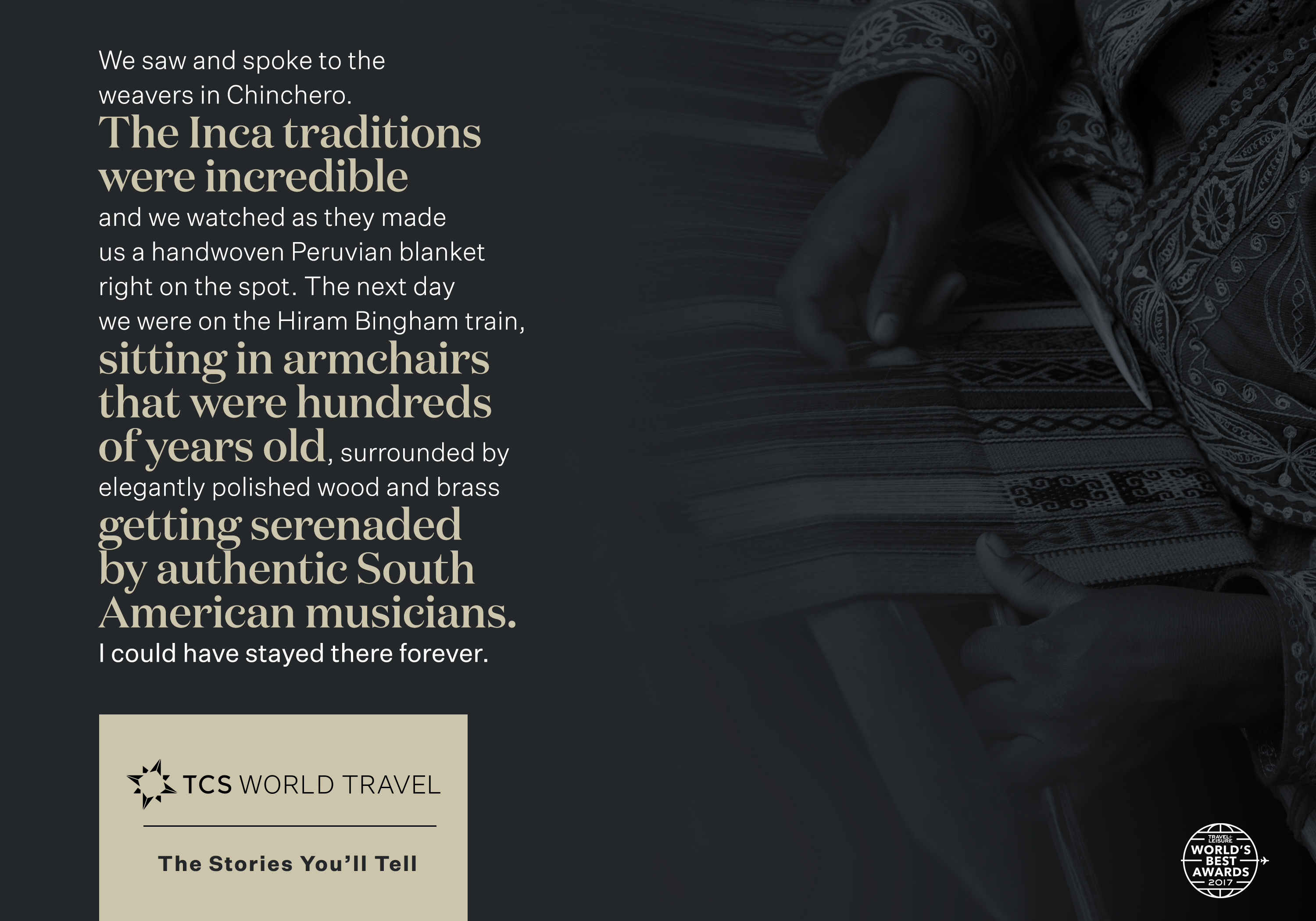 This direction focused on the incredible stories people bring back after their trips. Minimal imagery, text-heavy visuals allowed us to really focus in on the amazing experiences TCS World Travel offers.
